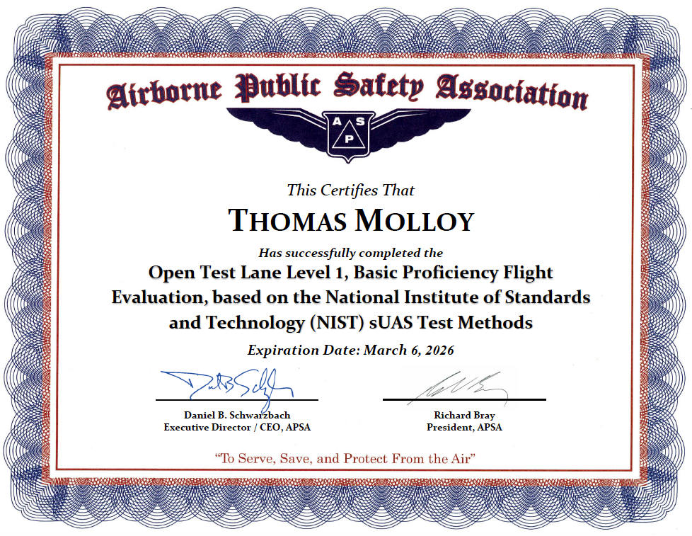 After 22 years of active duty service in the Coast Guard, Thomas developed extensive experience working on the Columbia River and Pacific Northwest coastline as a U.S. Coast Guard Short Range Unmanned Aerial Systems Instructor at the National Motor Lifeboat School. His operational background provides a strong foundation for conducting safe and professional aerial operations.